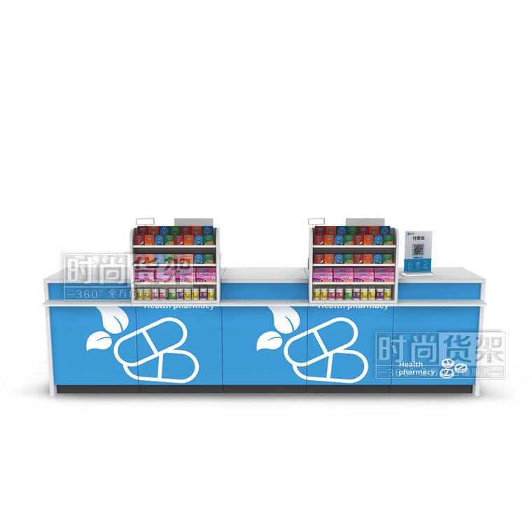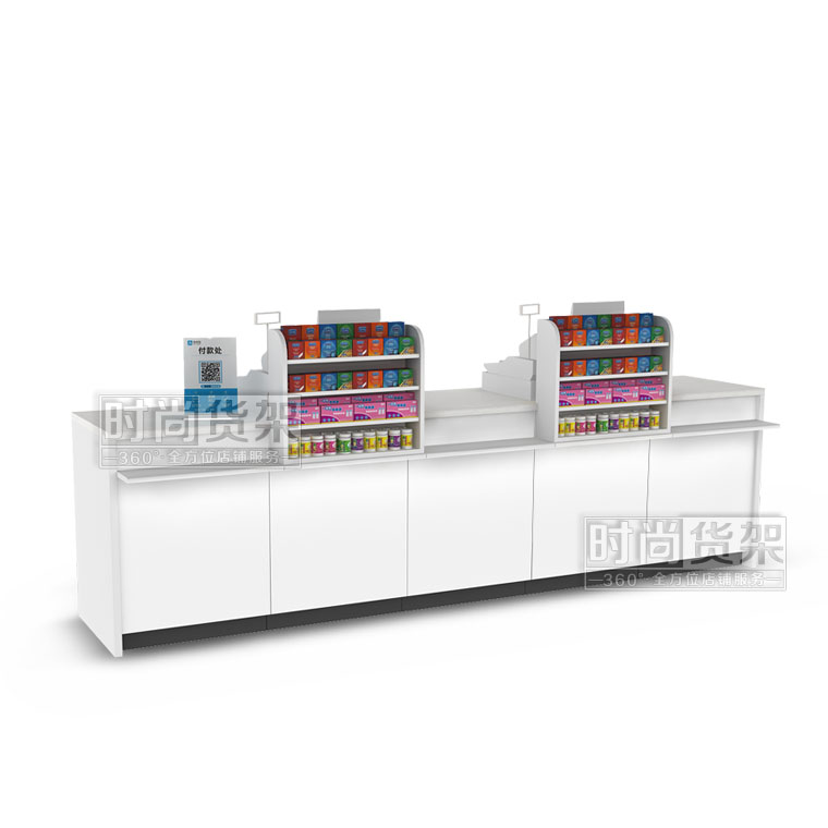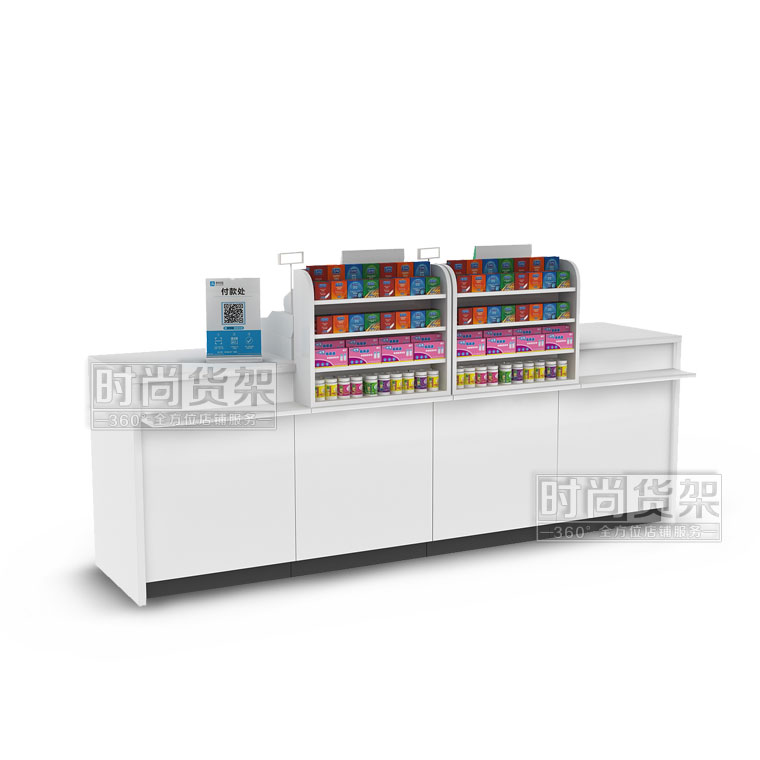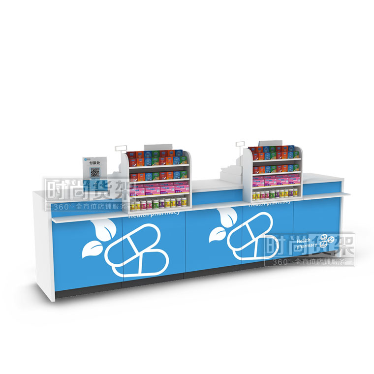 這是藥店貨架廠家【時尚貨架】最新打造的一款藥店收銀臺,如果你想了解其他的藥店貨架產品,請點擊m.childrenshome.com.cn/pharmacy/。