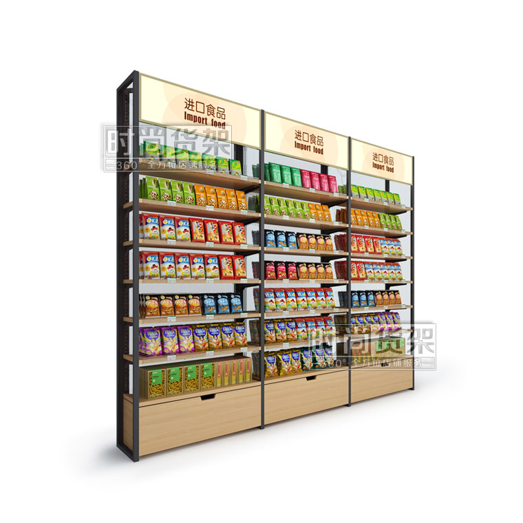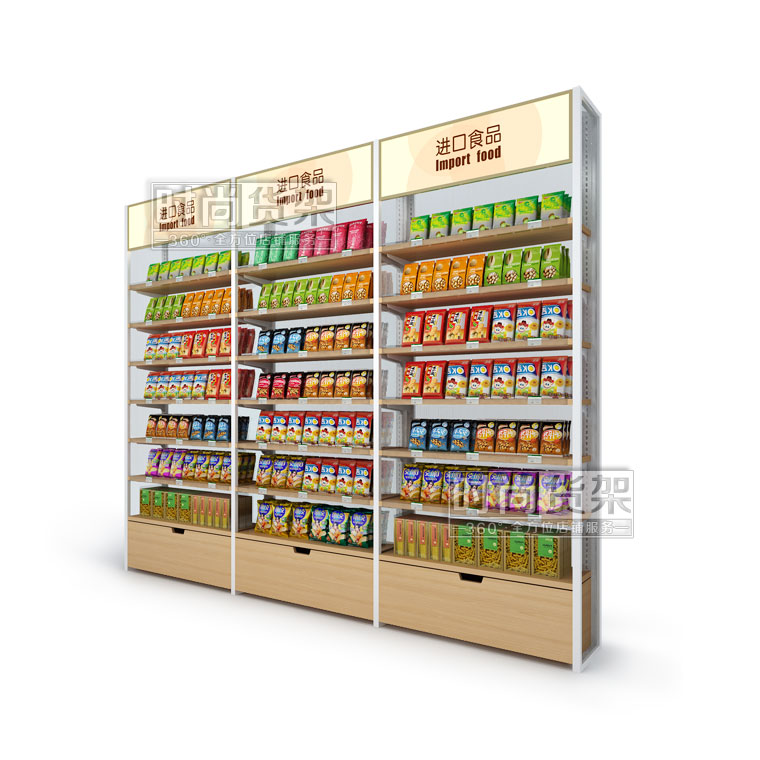 【描述】這款便利店單面食品架的背板及側板都是透光性較強的陽光背板,層板、立柱和側框則分別是環保木板和優質冷軋鋼材,堅固耐用,承重性強,擁有極長的使用壽命。