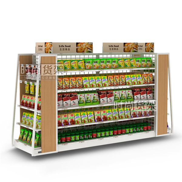 【描述】這款超市生活食品貨架同樣是雙面結構,適宜擺放在超市中間區域,更方便顧客拿取商品。頂端配置的廣告牌能對商品進行分類,更好地指引顧客選購商品。